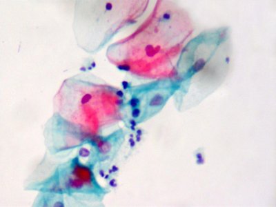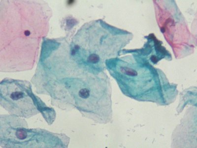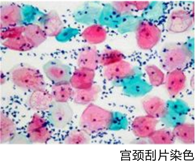 【染色結(jié)果】胞核染紫藍(lán)色;鱗狀上皮基底層、中層及表層角化前細(xì)胞胞質(zhì)染綠色,表層不完全角化細(xì)胞胞質(zhì)染粉紅色,完全角化細(xì)胞胞質(zhì)呈桔黃色;中性粒細(xì)胞和淋巴細(xì)胞、吞噬細(xì)胞胞質(zhì)均為藍(lán)色;紅細(xì)胞染粉紅色,粘液染淡藍(lán)色或粉紅色。高分化鱗癌細(xì)胞可染成粉紅色或桔黃色;腺癌胞質(zhì)呈灰藍(lán)色。